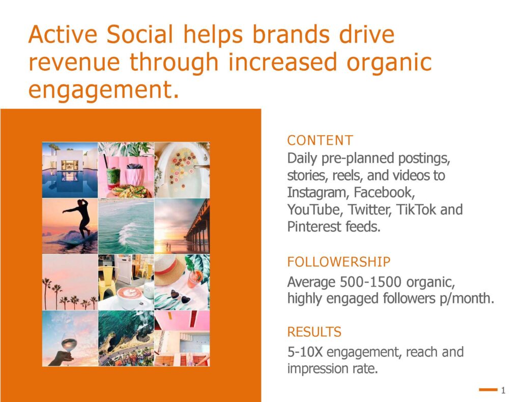Active Social helps brands drive revenue through increased organic engagement. We specialize in crafting compelling and engaging content tailored to elevate your brand’s storytelling.