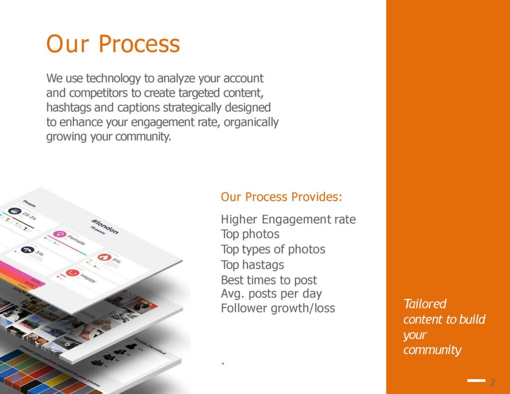 “We use technology to analyze your account and competitors to create targeted content, hashtags and captions strategically designed to enhance your engagement rate, organically growing your community.”